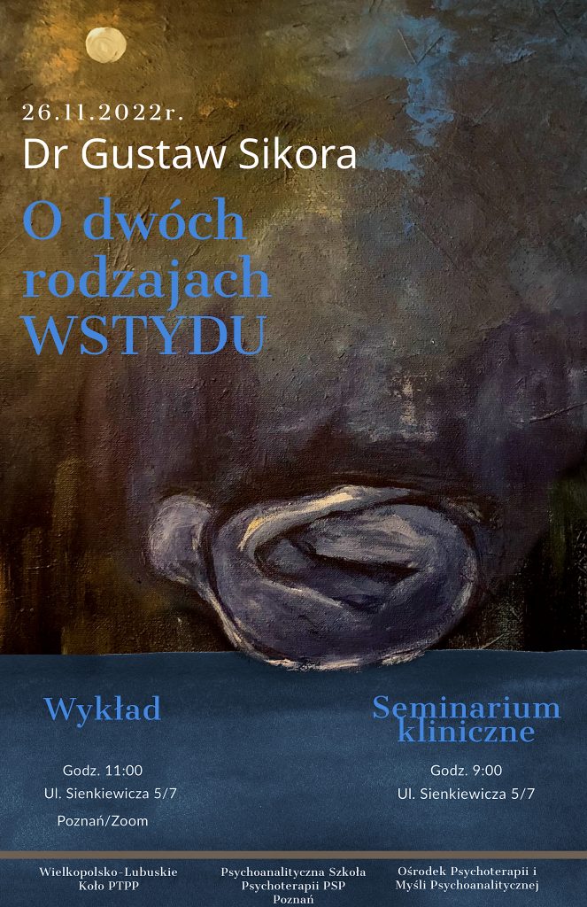 Wykład dr Gustawa Sikory „O dwóch rodzajach WSTYDU”, odbędzie się 26.11.22 o godzinie 11:00 w Ośrodku Psychoterapii i Myśli Psychoanalitycznej (ul. Sienkiewicza 5/7 Poznań). Będzie również możliwość wzięcia udziału w wykładzie za pośrednictwem platformy Zoom.